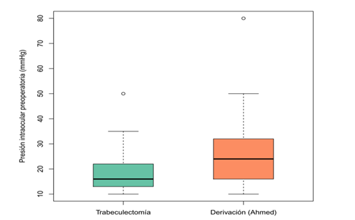 En nuestro estudio se observó que, en cuanto a la reducción porcentual en presión intraocular a las 12 semanas de seguimiento posquirúrgico, se obtuvo un valor promedio para el grupo de “trabeculectomía” del 22.84% partiendo de una PIO prequirúrgica media de 18.69 mmHg. Estos datos tras la comparación estadística con los valores de la válvula Ahmed mostraron que la trabeculectomía mantiene un mejor control en presiones prequirúrgicas menores que las reportadas para la válvula Ahmed. Mientras que en el estudio realizado por Midgal y cols. Una PIO alta en el momento de la cirugía fue perjudicial para el resultado de la trabeculectomía. Pacientes con una PIO preoperatoria igual o mayor de 40 mmHg tuvieron un éxito de 22.6% al quinto año, mientras que en aquellos con una presión preoperatoria < 40 mmHg, el éxito fue de 55.2%.