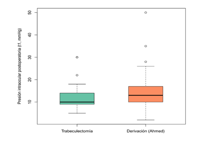 Podemos concluir que la derivación con válvula Ahmed resulta en mejores resultados postoperatorios, los cuales se observan después de la segunda consulta de seguimiento, por lo cual esta técnica trae mejores resultados a manejos de la PIO de los pacientes que requieren tratamiento quirúrgico, a pesar de que la trabeculectomía sea el estándar de oro ya no representa mayores beneficios que utilizar una técnica menos invasiva como lo es la válvula Ahmed.