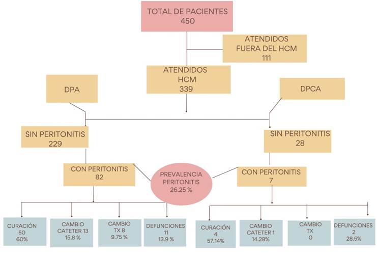 Del universo de pacientes en terapia de sustitución de función renal modalidad diálisis peritoneal, se revisaron, recolectando los datos en Excel y se analizaron los que son evaluados en el HCM , a fin de determinar cuál es la prevalencia general de peritonitis de pacientes durante el 2021, además se recabaron los datos generales considerando las comorbilidades asociadas a ERC más comunes, así mismo a través de análisis inferencial (t pareada) se buscó de forma intencional la relación entre la modalidad de diálisis y los eventos de peritonitis además del tiempo en diálisis, tomando como cohorte más o menos tres años, así como obtener la etiología más común y los desenlaces.