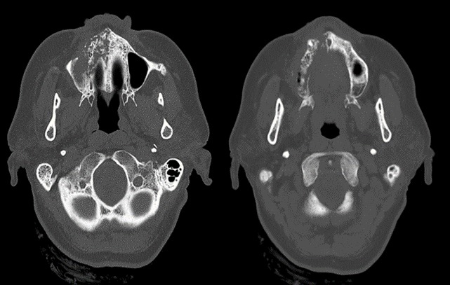 En estructuras óseas se identifican datos de erosión ósea con pérdida de la morfología habitual en hueso maxilar superior derecho y pared anterior del seno maxilar derecho, con misma erosión ósea en paladar duro ipsilateral. (Cortesía: área de radiología e imagen del Hospital Militar Regional de Especialidades de Mazatlán, Sinaloa).