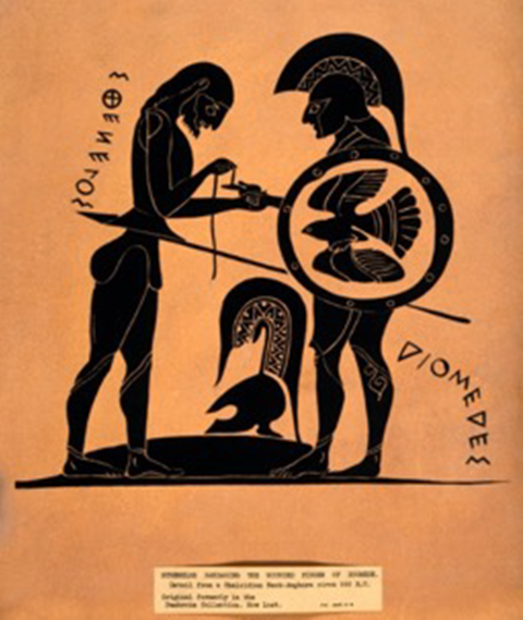 Figura 1 Estéleno vendando el dedo herido de Diomedes. Dibujo a tinta en ánfora de cuello calcídica c. 550 a. C.