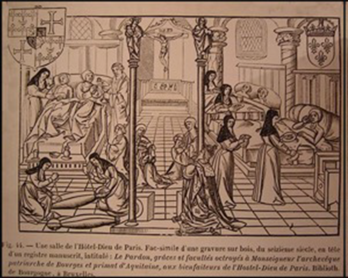 Figura 2 Grabado que representa la vida cotidiana en el Hôtel-Dieu en el siglo XVI. Expuesta en el Museo de la Asistencia Pública de París