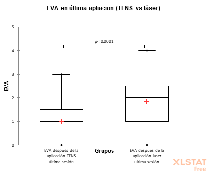 Grafica 3 Comparación de EVA después de la última aplicación de corrientes TENS vs ultima aplicación con láser terapéutico (p<0.0001)