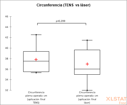 Se evaluó el edema en la rodilla del paciente posoperado de artroscopia antes y después al tratamiento con corrientes TENS, láser terapéutico mediante circometría (n=7). Se compararon ambas técnicas al final de la última sesión. No encontrándose diferencias estadísticamente significativas (Tabla 3, Gráfica 4).