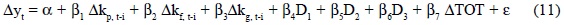 Lower case letters denote natural logarithms, Δ is the difference operator, and i denotes the lag lengths; y represents the natural log of real GDP per worker (1977 pesos); Δyt is the labor productivity growth rate and it is defined as, (ΔlnY - ΔlnL); kp, kf and kg denote, respectively, the natural log of the stocks of private capital per worker, FDI capital per worker, and public capital per worker (1977 pesos); Δkp is the growth rate in the private capital stock per worker and is defined as (ΔlnKp - ΔlnL), and likewise for the other variables in factor-intensive form; D1 is a dummy variable that equals 1 for the crises years of 1973 (military coup), 1975 (major economic recession), 1982-1983 (major economic recession) and 0 otherwise, while D2 equals 1 for the debt-led growth years of 1978-1981; and D3 is set equal to 1 for the 1987-1997 period (acceleration of real economic growth associated with the Chilean government's decision to pursue vigorously an outward oriented strategy of economic development beginning in 1986-1987). Given the historical (and continuing importance) of copper exports to the Chilean economy, the regression also includes a terms of trade variable, ΔΤΟΤ, which is defined as the percentage change in the terms of trade. An increase in ΔΤΟΤ denotes an improvement in Chile's terms of trade (see Ffrench-Davis and Munoz, 1992).