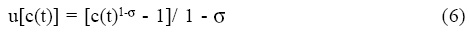 Representative agents in the economy attempt to maximize over time the present value of a standard concave utility function given in equation (5) below: