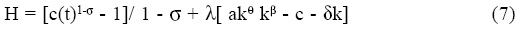 where σ denotes the relative risk-aversion coefficient or the inverse of the elasticity of substitution between current and future consumption; that is, σ is an index of the representative consumer's willingness to trade off current consumption for future consumption. To solve the inter-temporal utility maximization problem we construct the current Hamiltonian value:
