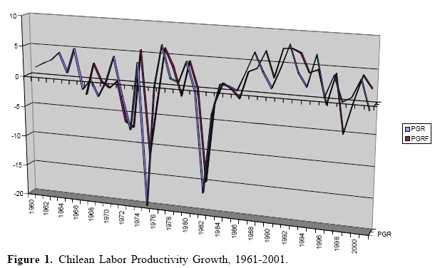 Figure 1, corresponding to equation (4) in Table 3, provides visual evidence of the models' ability to track the turning points in the actual series. (PGR) refers to the actual series and (PGRF) denotes the in-sample fit. It also highlights the Chilean economy's highly variable and, at best, modest increase in labor productivity for the period under review. Part of the explanation for this lackluster performance resides in the country's tumultuous economic and political history, particularly during the seventies and early eighties. However, beginning in 1985 and following the return to democratic rule, there is evidence of a modest upward trend in labor productivity, although it is too early to tell whether this represents a permanent break with the past.