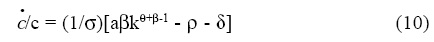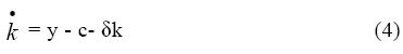The production function in (3) will be homogenous of degree 1 in k, and therefore display endogenous growth, provided that θ + β = 1. Before turning to the competitive solution, it is assumed that the economy produces one good that can be devoted to consumption or investment. The economy's rate of capital accumulation in per capita terms can therefore be represented by the standard equation given below.