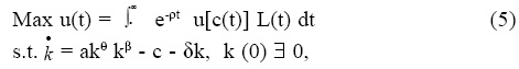 where, again, for convenience, lower case letters are defined in per capita terms and p is the discount rate; L(t) is the size of the family; c(t) is per capita consumption, and a dot over the variable denotes the derivative with respect to time. For simplicity, the initial population is normalized to 1 so that the analysis in aggregate terms and per capita terms is the same. The instantaneous utility function of the representative (infinite lifetime) consumer is assumed to exhibit constant relative risk and can be written in the general form: