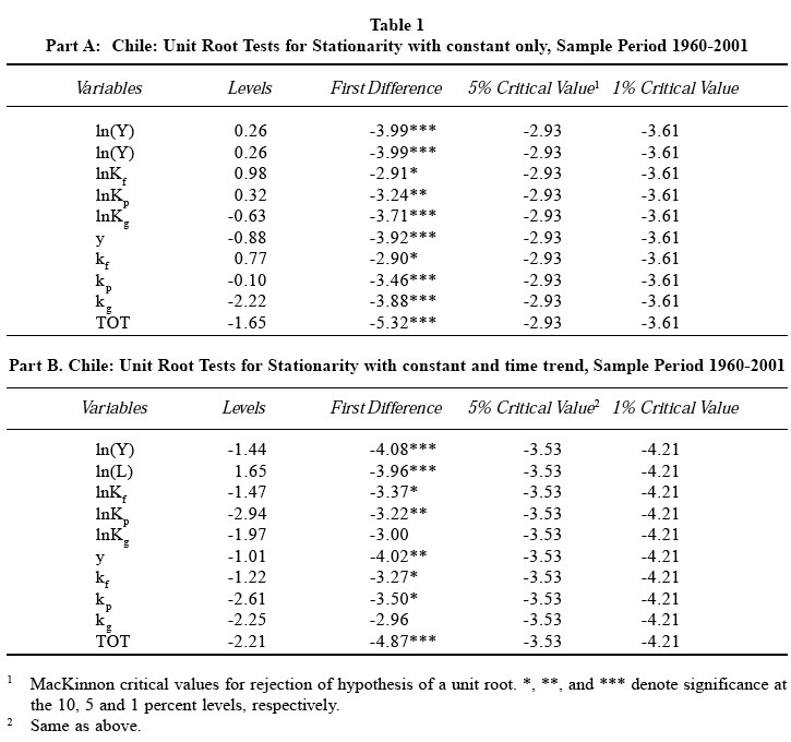 6 The government consumption variable was not included in the estimation because not only does it include human capital investments such as expenditures on health and education (which are likely to enhance labor productivity), but also a substantial portion is devoted to expenditures on public wages and salaries (which are likely to have a negative effect). The available data from the Central Bank of Chile is not sufficiently disaggregated to generate a human capital variable via the perpetual inventory model.