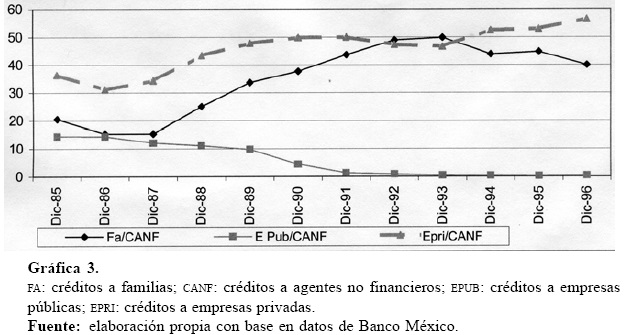 Sin embargo, un análisis más profundo de la información estadística indica que los principales receptores de créditos (vigentes, redescuento y vencidos) entre los agentes no financieros fueron las familias (estadísticas disponibles de 1985 a 1996) con una participación creciente entre 1989 y 1994, situación que se revierte luego de la crisis. Después de 1994 las empresas privadas captan una proporción creciente de los créditos a los agentes no financieros (explicados por los compromisos pendientes y el aumento de los intereses; véase Gráfica 3). Por su parte, la cartera crediticia de la empresa pública (vigente, redescuento y vencida) tiene una tendencia hacia la baja como resultado del proceso de la privatización de las empresas estatales, lo cual refleja los efectos de la desregulación bancaria en la liberalización de recursos financieros para incrementar la disponibilidad del sector privado. Por consiguiente, no encontramos evidencia en el sistema financiero mexicano de la relación positiva entre el gasto de la inversión y los volúmenes crecientes de crédito, lo cual se vuelve más claro durante la segunda fase de recuperación del periodo de globalización (1997-2000), en el que incluso se presenta una reducción del flujo crediticio (1999-2001).