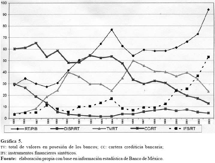Finalmente, una alusión especial a los instrumentos financieros sintéticos. Entre 1989 y 1994, éstos tienen una participación creciente (pasan de 8.1 a 17.4%), retoman su crecimiento desde 1999 y en 2003 explican más de la mitad de los recursos totales. Ello indica un cambio estructural del sistema bancario. A partir de 2000, cuando la banca comercial está dominada por la extranjera, dichos instrumentos crecen significativamente, lo cual refleja la adecuación de los bancos comerciales al entorno internacional.