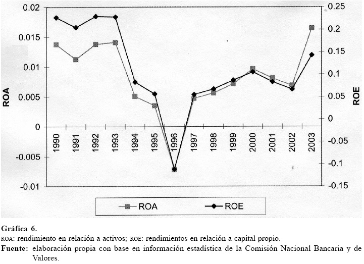 Los indicadores globales de rendimiento bancario (ROE y ROA, sobre capital propio y sobre activos, respectivamente) muestran que las utilidades se recuperaron después de la crisis y, en el caso del ROA, alcanzó niveles superiores a los años previos a la crisis (véase Gráfica 6).