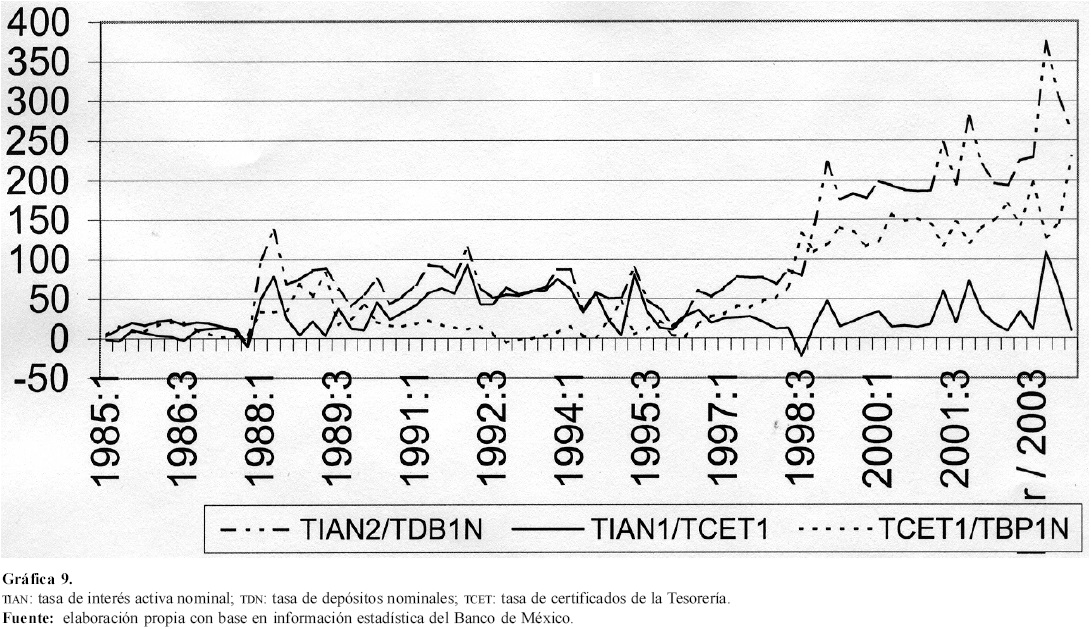 A partir de 1995 aumentó el ingreso por bonos (intereses y premios devengados por reportos y préstamos de valores). Inicialmente, ello reflejó el programa de rescate gubernamental de la banca (efecto amortiguador) y, posteriormente, tuvieron gran participación los reportos, instrumento fundamental de intervención de la banca central en la comercial. Ello fue acompañado por un cambio en la estructura de la tasa de interés. Las tasas de interés de depósitos actúan como el ancla de las utilidades de la banca, con lo que se amplía el margen entre la tasa de los CETES y la de los depósitos, y se reduce el margen entre la tasa de interés activa y la de los CETES (véase Gráfica 9). Medidas adicionales que incrementaron las utilidades bancarias son la creciente disponibilidad de liquidez por el cambio de pago de nóminas mediante tarjetas de débito, y las limitaciones al movimiento ascendente de las tasas activas, impuesto por la globalización financiera.