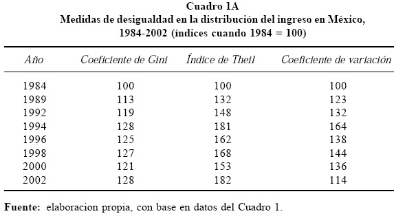 Los resultados de los cálculos de los índices de desigualdad se muestran en los cuadros 1 y 1A, así como en la Gráfica 1. Estos datos muestran que tras un periodo de cierta estabilidad en la distribución del ingreso, se produce una clara tendencia al incremento de la desigualdad en México, sobre todo hasta 1994 y 2002.