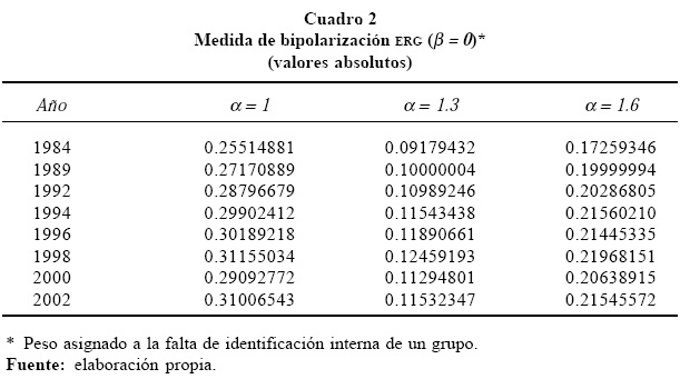 Los datos presentados a continuación consideran dos grupos de ingreso, los cuales se forman a partir de la media: el primero formado por los que se encuentran arriba de la media, y el segundo, por los que se encuentran debajo. Se toman diferentes grados de sensibilidad (α) respecto de la polarización.