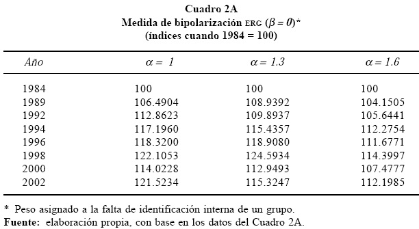En los cuadros 2 y 2A, además de la Gráfica 2, se muestran los resultados del cálculo de la medida de bipolarización EGR. La bipolarización entre los dos grupos salariales se manifiesta en la distancia entre ellos, resultado de la proporción de salarios entre los grupos situados encima y debajo de la media.
