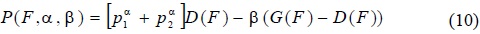 donde: F es la distribución F; α es el grado de sensibilidad con respecto a la polarización, que varía de 1.0 a 1.6; β es el peso asignado a la falta de identificación interna; p1, p2 son las proporciones de individuos en los grupos 1 y 2 con respecto del total;D(F) = p1 -L(p1), es la desviación de la media, y G, el coeficiente de Gini de la distribución F.