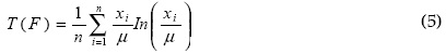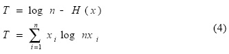 donde: xi es la porción de ingreso que recibe el individuo i, y cuando todas las xi son iguales a (1/n), H(x) alcanza su valor máximo, (log n); H(x) es la medida de entropía esperada de la situación, considerada como la suma del contenido informativo de cada suceso ponderado por su probabilidad; T es la medida de desigualdad o índice de Theil, y n, el número total de datos.6