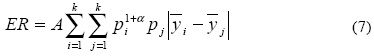 donde: A es un escalar positivo cuyo objetivo es normalizar; α es el grado de sensibilidad con respecto a la población; k el número de grupos o clases; pi, pj las proporciones de personas en los grupos i y j, con respecto al total, y