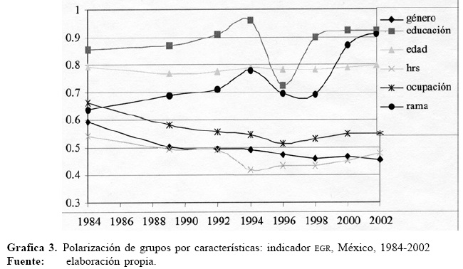2) Lo anterior sugiere que, a diferencia de lo que sucede en países desarrollados, en México el crecimiento económico no afecta uniformemente a los grupos de mayores beneficios, a los más educados y a quienes trabajan en actividades no agrícolas. Esto se corrobora con los resultados del análisis de polarización, que se comentan a continuación.