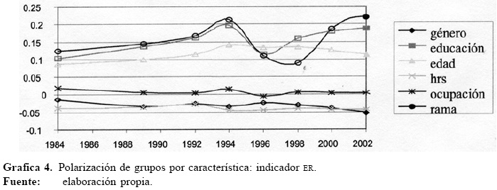 Las gráficas 3 y 4 presentan la evolución de la polarización por características, sugiriendo que la mayor polarización salarial se alcanza debido a las diferencias en escolaridad; asimismo sugieren que la escolaridad muestra los grupos más polarizados entre sí. La ocupación presenta con más claridad una tendencia decreciente, salvo al final del periodo. La edad y rama de la actividad son las características que presentan una senda de polarización creciente en los últimos años. En particular, la edad consigue superar en polarización a la ocupación, y se sitúa tras la escolaridad como la característica que genera más polarización, por lo menos hasta 1998. Las variables de género y horas trabajadas son las que muestran menor polarización, a pesar de que la primera, debido a su carácter dicotómico, presenta una importante polarización entre grupos (aunque es decreciente desde el periodo de inicio).