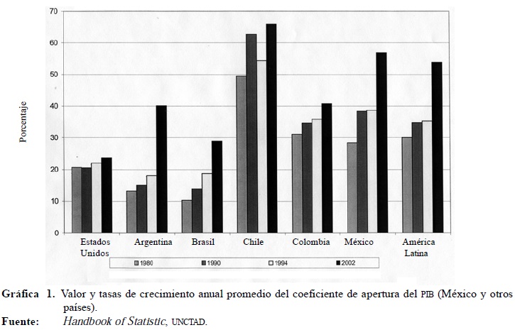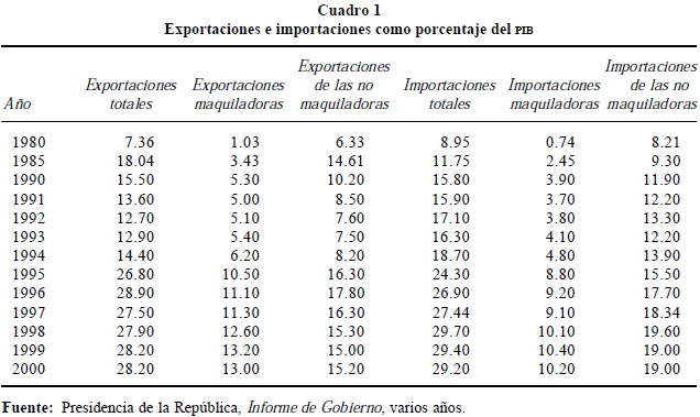 El resultado de estas medidas, en términos de comercio internacional, ha sido notable. De 1980 a 2000 las exportaciones crecieron a una tasa promedio de 7.9% al año, dos puntos porcentuales más que en el periodo 1940-1982; esto, a pesar de que el valor de las exportaciones de las actividades extractivas (principalmente petróleo) se redujo considerablemente durante el lapso citado. Este rápido crecimiento se reflejó en el cambio en la composición de las exportaciones e importaciones como porcentaje del PIB (véase Cuadro 1).