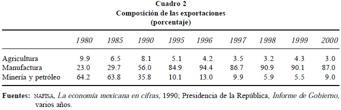Las exportaciones de manufacturas registraron el mayor crecimiento. Durante el periodo 1982-2000 crecieron a una tasa anual de 18.8%, 11 puntos porcentuales más que en el periodo 1940-1982. Las exportaciones agrícolas aumentaron a una tasa anual de 6.2%, casi cuatro puntos porcentuales más que en el periodo 1940-1982. Estas diferentes tasas de crecimiento de las categorías de exportaciones trajeron consigo un cambio notable en la composición de las exportaciones. En el Cuadro 2 observamos que las exportaciones mineras en 1982 (básicamente petróleo crudo) representaban 76% de las totales. para el año 2000 este porcentaje se redujo a 9%; en contraste, las exportaciones manufactureras pasaron de 16% del total en 1982 a 87% en 2000.