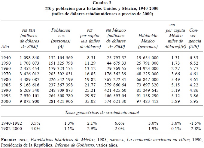 De 1982 año en que irrumpió la crisis de deuda y se rivirtió la estrategia de sustitución de importaciones a 2000, el PIB por habitante en México se ha incrementado a una tasa anual de 0.1%. Durante el mismo periodo, en Estados Unidos el ingreso por habitante creció a una tasa de 2.9% al año. Esta diferencia en las tasas de crecimiento ha hecho más grande la brecha entre el ingreso por habitante en los dos países; en 2000, el PIB por habitante en Estados Unidos era seis veces mayor que el de México, cifra superior a la registrada en 1960 (véase Cuadro 3).3 Se considera al valor promedio del ingreso per capita (PIB/C) un buen indicador del nivel de desarrollo y una aproximación a la dotación de factores. Según Helpman y Krugman (1981), los países con ingresos per capita superiores tienen mayor capacidad para innvoar y producir bienes diferenciados, con procesos intensivos en capital y tecnología; además, al tener más información y superiores sistemas de comunicación, expanden aceleradamente su comercio en bienes diferenciados (Loertscher y Wolter, 1980). El ingreso per capita señala la estructura de la demanda y, en virtud de la diferenciación de su oferta, la capacidad de la producción de un país para adaptarse a los cambios en el ambiente internacional con mayor flexibilidad que las naciones menos desarrolladas. De acuerdo con el historiador John coatsworth, el ingreso por habitante es el indicador que mejor revela al economista y al historiador el nivel de productividad y, por lo tanto, el estado de una economía (coatsworth, 1990:25).