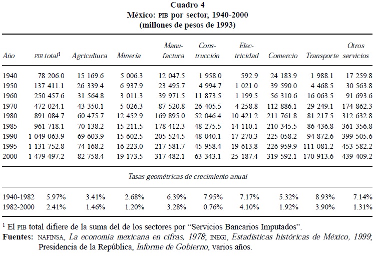 La comparación de las tasas de crecimiento por actividad económica entre 1940-1982 y 1982-2000 muestra resultados muy desfavorables para el periodo reciente. Entre 1982 y 2000, en la mayor parte de los casos, las tasas de crecimiento del valor agregado en estas actividades se redujeron a menos de la mitad de las registradas en el periodo previo. Un caso notable son las manufacturas, que en años recientes experimentaron un aumento espectacular de las tasas de crecimiento de exportaciones y, pese a ello, el sector muestra tasas de casi la mitad de las registradas en el lapso de sustitución de importaciones (véase cuadro 4).