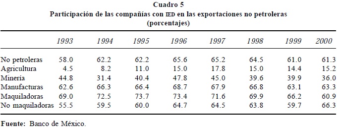 Cuando analizamos la nacionalidad de las firmas que realizan el mayor porcentaje de las exportaciones, encontramos que la mayor parte de éstas son extranjeras. En el cuadro 5 mostramos que las firmas con inversión extranjera directa (IED) realizan alrededor de 60% del total de las exportaciones no petroleras. En el sector manufacturero esta participación es todavía más alta.