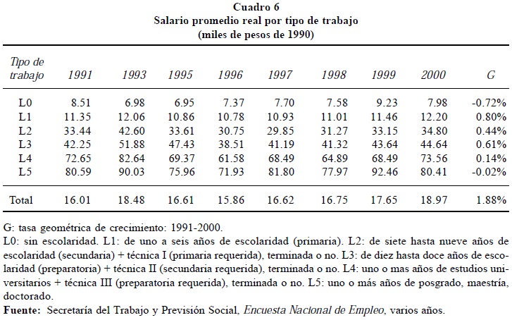 Con otras fuentes, y para diferentes años, analizamos este fenómeno y encontramos resultados similares. El cuadro 6, basado en datos anuales de ocho encuestas de empleo (Encuesta Nacional de Empleo para los años 1991, 1993 y de 1995 al 2000), muestra la evolución de los salarios por tipo de trabajo. para cada encuesta se ilustran los salarios promedio de seis tipos de trabajo y la respectiva tasa de crecimiento salarial. Son evidentes: el decremento en salario promedio anual de los menos y de los más educados; crecimiento modesto de los niveles intermedios y crecimiento moderado en los salarios promedio del conjunto de los trabajadores (véase columna G, tasas de crecimiento).