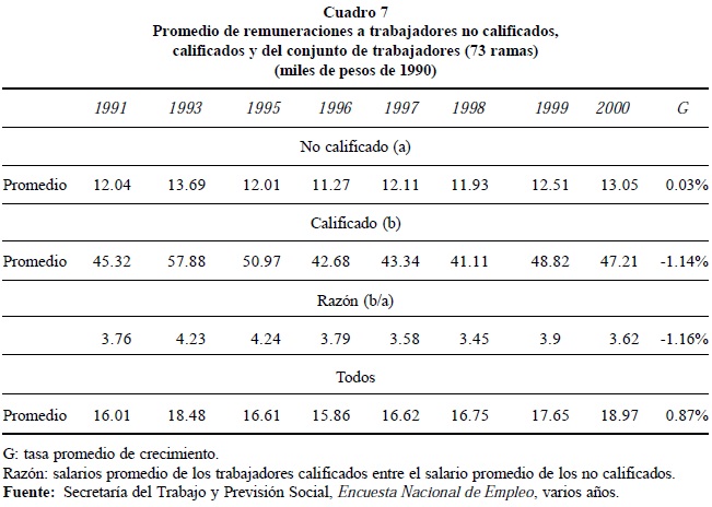 7 Esta diferencia en las tasas de crecimiento de los salarios implicó una menor desigualdad entre ambos tipos de trabajo, lo cual puede observarse en el renglón Razón, que registra el cociente del salario medio de los calificados y los no calificados.