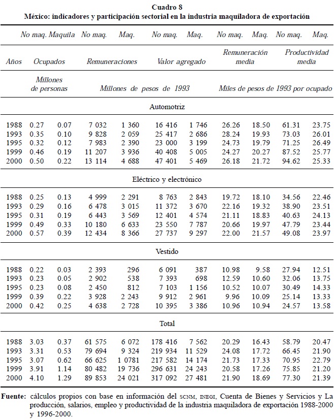 La maquila fue la generadora de empleo más dinámica del sector manufacturero total (una tasa de 333.3% durante 1988-2000), con tasas de crecimiento superiores a las de la industria manufacturera. En 1988 representó 9.9% del empleo manufacturero y 26.7% en 2000. La expansión del empleo maquilador se pudo realizar trasladando mano de obra desde actividades no manufactureras de menor productividad (es decir, absorbiendo trabajo no específico), o desde la manufactura misma, pero de actividades menos rentables que la maquila. También se pudo ocupar la mano de obra que se libera del traslado de segmentos intensivos en capital al exterior, resultante del conocido proceso de desintegración de las cadenas productivas y la pérdida de contenido nacional de la producción mexicana. En los dos primeros casos, habría aumentos en productividad total y de salarios, y en el tercero, el efecto podría ser o nulo o negativo.