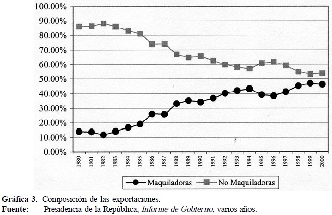 Este análisis es capaz de explicar claramente lo sucedido en México en años recientes, el auge espectacular de las exportaciones manufactureras, especialmente de las registradas en el régimen de maquila, así como el estancamiento (o disminución) de los salarios reales y el aumento a las remuneraciones reales al capital.