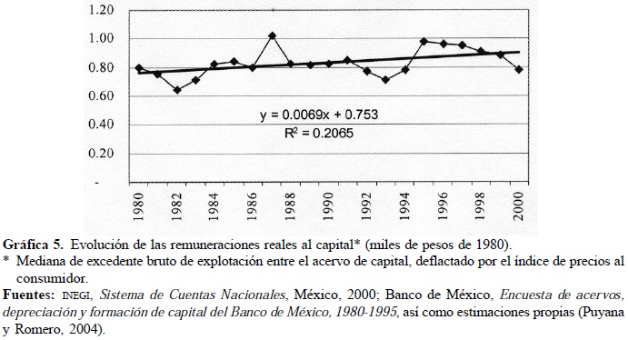 En contraste con la tendencia al estancamiento de los salarios reales en los últimos veinte años, las remuneraciones al capital muestran una tendencia a la alza (estadísticamente significativa) durante este periodo (véase Gráfica 5).