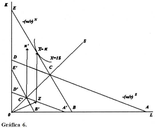 Con el libre comercio podemos identificar qué país va a producir cada bien final. Esto se logra buscando las isocuantas de valor unitario de cada bien (con valor de 1$, no mostradas), las cuales son tangentes a la línea quebrada formada por la parte externa de los dos segmentos de isocosto correspondientes a cada nación (la línea ACE). Aquí encontramos que todos los bienes que produce el sur son más intensivos en trabajo que todos los del norte. Puesto que existen muchos bienes, algunos de ellos pueden ser elaborados en los dos países, pero para facilitar el análisis consideramos que cada bien se produce en un sola nación. Uno de éstos es X, cuya isocuanta de valor unitario se muestra en la Gráfica 6. Ese bien es producido en el norte, ya que es intensivo en capital.