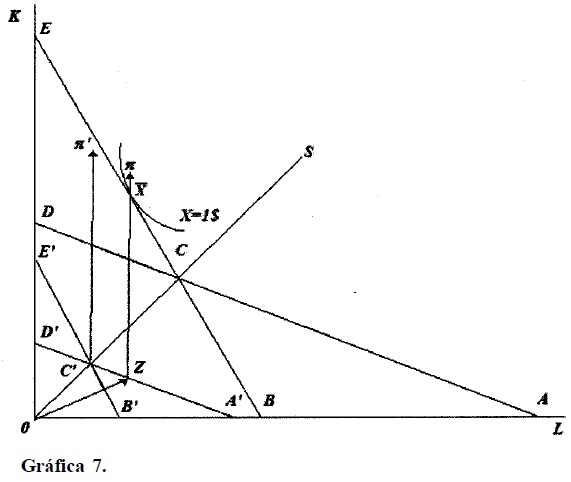 En la Gráfica 7 se muestra el caso de una fragmentación costosa en términos de uso de factores, pero factible en costos monetarios. La construcción es similar a la Gráfica 6. En este caso, cuando uno de los fragmentos se produce en el país intensivo en trabajo, se ahorra lo suficiente para compensar el mayor uso de factores y puede utilizarse la tecnología fragmentada. El punto π' se encuentra debajo de la línea de isocosto original ECB.
