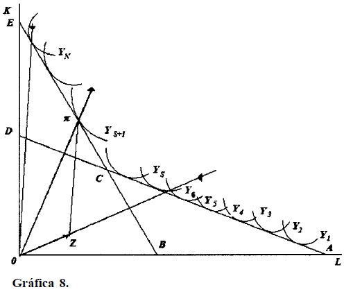 Consideremos ahora la presión sobre los precios de los factores de esta nueva tecnología, representada por las flechas oscuras en la Gráfica 8, situadas por arriba de las líneas de isocosto de ambos países.