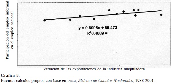Si la maquila demandara factor trabajo de la manufactura, habría traslado desde ésta a aquélla y el crecimiento neto del empleo sería menor y más reducidos los impactos sobre la productividad y los ingresos totales, aunque los salarios de la maquila serían mayores. No habría necesariamente una relación directa ni fuerte entre el crecimiento de las exportaciones de la maquila y la participación del empleo manufacturero ni del valor agregado en los totales. Probablemente tampoco se registraría una relación vigorosa entre la tasa de crecimiento de las exportaciones de maquila y la productividad del sector manufacturero total, ni las remuneraciones. En el caso de que se libere mano de obra por el ajuste en el sector manufacturero no maquilador, pueden presentarse dos situaciones: la primera, que la maquila acapara ese desempleo enrolando la mano de obra relativamente más calificada, con menor salario y en actividades de menor exigencia técnica; la segunda, que la maquila absorba la mano de obra menos calificada que se libera de la industria. En estas condiciones, el empleo total manufacturero no crecería. Y es lo que ha ocurrido, como se desprende de la muy baja relación entre el crecimiento de las exportaciones de maquila y el empleo manufacturero total: el crecimiento de un punto porcentual en las exportaciones maquiladoras se reflejaría en otro del 0.05 de peso del empleo manufacturero en el total. Estos datos reflejan el ajuste que realizó manufactura no maquiladora, en respuesta a las crisis y a los cambios en el entorno institucional: elevar la productividad por trabajador reduciendo el empleo (y manteniendo o incrementando la producción total), más que por nuevos aportes de capital por trabajador. En este caso, la maquila pudo absorber este empleo y expandir su participación en la ocupación total, sin que se elevaran los salarios. En estas condiciones se debería considerar que la fuente principal del trabajo para la maquila no fue el mercado laboral informal. Este supuesto parece corroborarse con la relación directa, y más significativa, entre las exportaciones de maquila y el empleo informal, en el sentido de que la expansión de las exportaciones de la maquila coincide con el crecimiento del peso del empleo informal, como porcentaje del empleo total. Esta trayectoria del empleo informal sugiere que la expansión de la producción y de las exportaciones de la ime no absorbieron la fuerza laboral desplazada de las manufacturas no maquiladoras, el empleo formal que generaron no tuvo la magnitud que permitiera reducir el peso de la informalidad en la ocupación total (véase Gráfica 9).