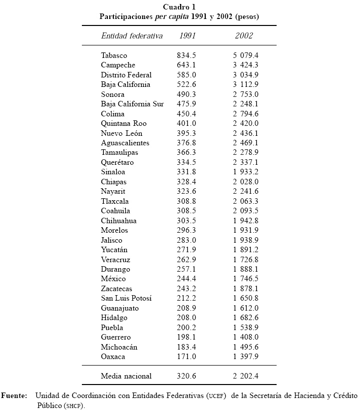 4) A partir de los años noventa, la fórmula de distribución de participaciones refuerza los criterios de equidad, aunque mantiene incentivos al esfuerzo recaudatorio de las entidades federativas. Como puede verse en el Cuadro 1, las entidades que recibieron más recursos per capita en 2002 fueron Tabasco, Campeche, Baja California, Distrito Federal y Colima. En el otro extremo, Oaxaca, Guerrero, Michoacán, son las entidades federativas que menos fondos per capita recibieron. La diferencia entre los estados que reciben mayores recursos y los que menos reciben en términos per capita se redujo de 4.9 veces en 1991 a 3.6 en 2002.