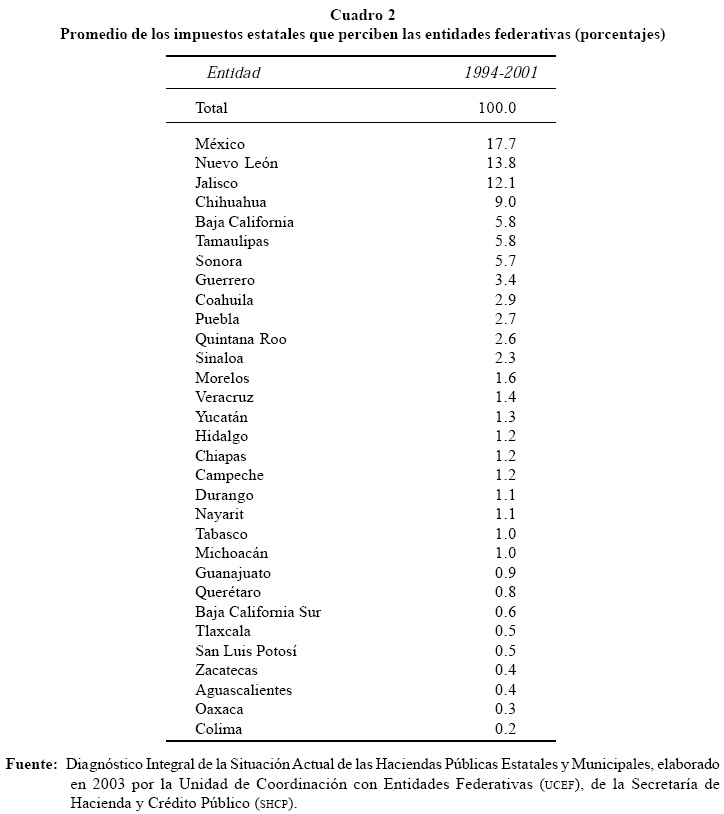 Además, está el problema de la baja eficiencia recaudatoria de algunas entidades federativas y municipios. Como puede verse en el Cuadro 2, del total de ingresos tributarios obtenidos por las entidades federativas en el periodo 1994-2001, el Estado de México obtuvo 17.7%, y en el otro extremo se encuentra Colima, con 0.2%.