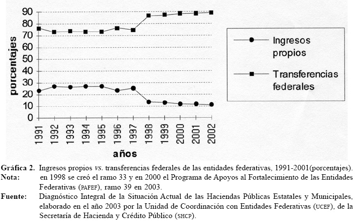 b) El sistema ha dado lugar a una gran dependencia de los gobiernos locales con respecto al federal. Como puede verse en la Gráfica 2, los ingresos propios de los estados representaron 23.5% en 1991, mientras que once años después, en 2002, fueron solamente 10.9% del total de sus ingresos.