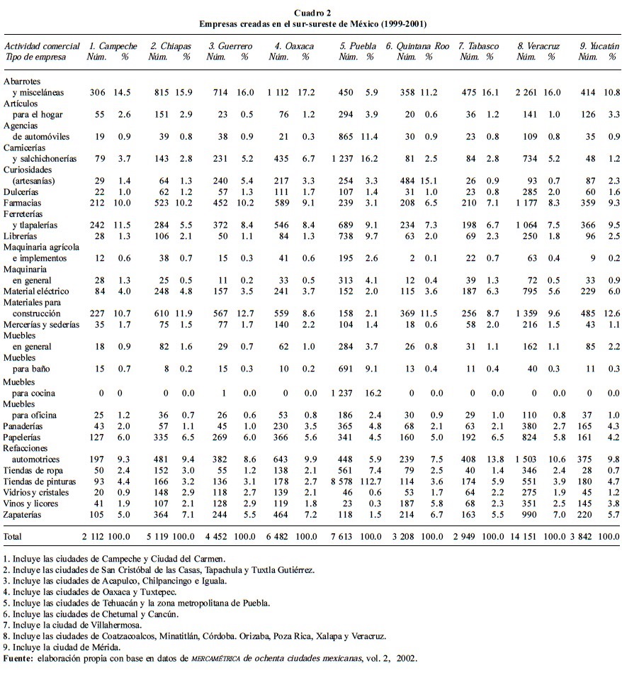 Un comportamiento similar observamos en las empresas productivas y la naturaleza de las mismas. A pesar de que la región está conformada por nueve estados que equivale, en concentración, a poco más de la tercera parte de la población mexicana y a casi la mitad de la superficie del país, apenas cuenta con la presencia de poco menos de 18% de los establecimientos. Entre ellos, aparecen nuevamente Quintana Roo, Yucatán, Veracruz y Puebla como los únicos que tienen alguna representatividad importante en el territorio nacional, además de que por sí solos concentran cerca de 80% del total de los establecimientos en el nivel regional.