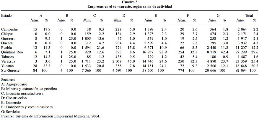 Un análisis sectorial de la presencia de capitales da cuenta de esas dificultades. De siete ramas de la producción consideradas (agropecuaria, minería y extracción de petróleo, industria manufacturera, construcción, comercio, servicios, transporte y comunicaciones) sólo Puebla, Quintana Roo, Veracruz y Yucatán registran una presencia de empresas relativamente importante en el nivel nacional; en el caso de Quintana Roo, que concentra la proporción más alta, 5.3%, obedece a la localización de empresas en el comercio y los servicios, las cuales surgieron gracias al desarrollo turístico observado en las tres últimas décadas, pero que podrían entrar en fase de agotamiento, tanto por la competencia mundial como por los eventos naturales que azotan la región y destruyen infraestructura. De cualquier manera, éste es un caso típico de desarrollo regional asimétrico en México y uno de los nichos regionales que más interesan a los proyectos globales, lo cual podría inducir a nuevas distorsiones regionales en el área del PPP.