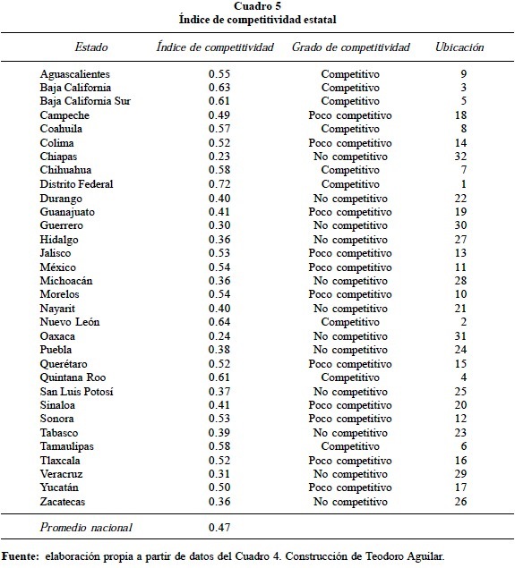 En la construcción del índice de competitividad no empleamos ponderaciones, ya que éstas obedecen, en términos estadísticos, al peso que cada variable aporta al total de los datos; sin embargo, como las variables se encuentran estandarizadas y su valor oscila entre 0 y 1, lo más que pueden aportar al total es uno. Como lo ideal sería que todas tuvieran valor de 1 entonces, en teoría, todas adquieren el mismo peso en el índice, por lo tanto, no puede ser índice compuesto, sino simple. Con los valores de los subíndices o factores de competitividad se construye el índice de competitividad estatal, el cual representa la media de los subíndices o factores de competitividad. Una vez evaluados y obtenido el valor numérico, los colocamos de mayor a menor para ubicarlos con respecto de su competitividad, de tal forma que el más competitivo aparece en primer lugar y así sucesivamente. Los criterios para determinar el grado de competitividad son los siguientes: si X es el dato observado, éste se encuentra en cierto intervalo y a cada uno de éstos le corresponde un grado en particular definido de la siguiente manera: