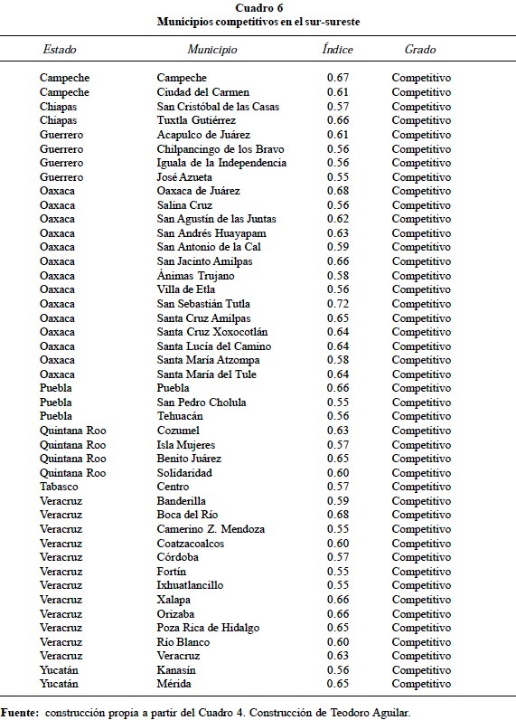 Los municipios competitivos corresponden a las capitales de los estados, centros turísticos y las zonas petroleras, los cuales, por su gran capacidad de generar riqueza, ocupan un lugar importante, sin que ello signifique que la riqueza generada se distribuya equitativamente entre la población. Caso atípico es el estado de Tabasco, el cual sólo ubica municipios del centro, donde se encuentra la capital del estado, como competitivos; similar al estado de Chiapas, donde nada más los municipios de Tuxtla Gutiérrez y San Cristóbal de las Casas son catalogados como competitivos, uno de ellos la capital del estado y el otro un importante centro turístico.