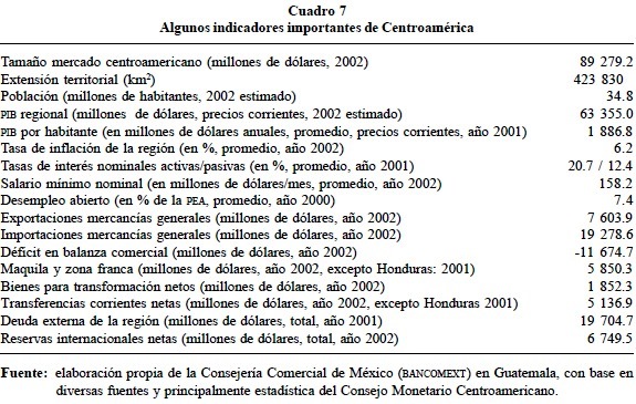 Centroamérica contaba hacia 2002 con una extensión territorial de 521 903 km2, 35 millones de habitantes, un intercambio comercial de 35 mil millones de dólares y PIB de 63 mil millones; el comercio interregional superó en 2002 los 3 mil millones, los principales socios comerciales son Estados Unidos con 38.3% del intercambio; el Mercado Común Centroamericano, 28.1%; la Unión Europea, 12.9% y el resto de países del mundo, 20.2% (SIECA, 2003). Es evidente que su intercambio resulta más diversificado que el de México pero, fuera de las manufacturas, la mayoría de los productos que exporta son similares a los de nuestro país y en algunos, como el café y la carne, son competidores de la región SSE, por lo cual su interés se centra en el mercado estadounidense, que se concretó con la firma de un tratado de libre comercio entre esa nación y las centroamericanas (CAFTA) a finales de 2003.
