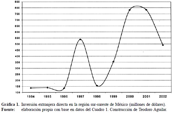 La región S-SE participó apenas con 3.6% en la recepción de IED en el nivel nacional durante el periodo 1999-2003. Esto significa que la gestión derivada del PPP no mostró señales positivas para atraer inversión, al menos como se esperaba en este primer momento, por lo que el Estado deberá participar más con inversiones públicas y, al mismo tiempo, mejorar los mecanismos de promoción externa, tendientes a un esquema endógeno de desarrollo regional.